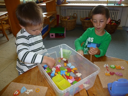 - Dass die Kinder aus einer Menge verschiedener Dinge zusammenpassende Dinge mit einer bestimmten Eigenschaft auswählen.